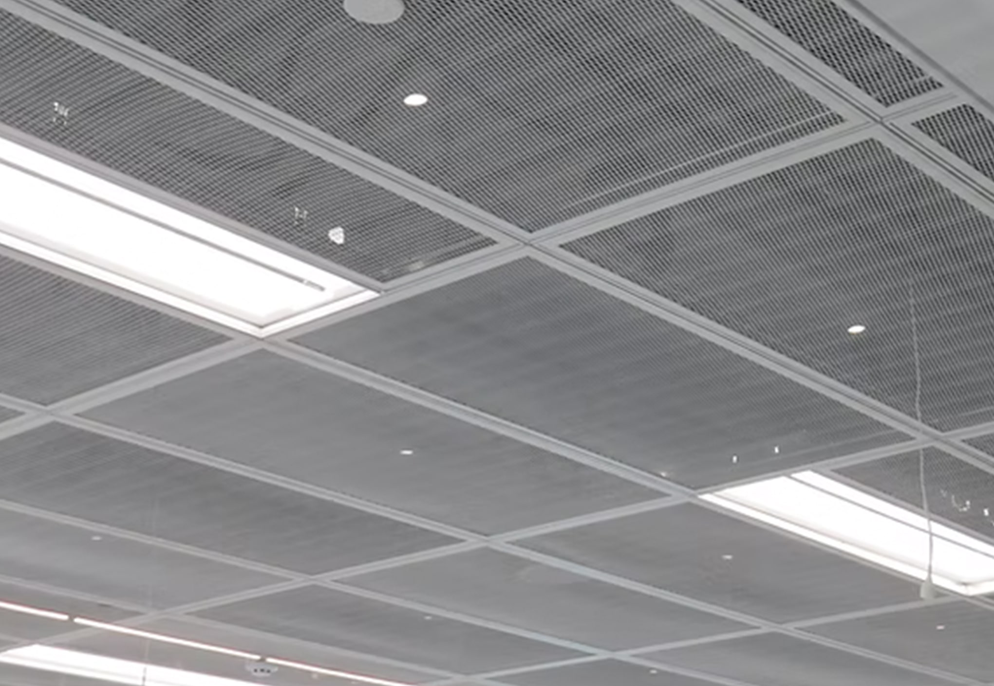 The expanded mesh ceiling’s open-grid design lets light and air pass through while creating a modern, airy look.