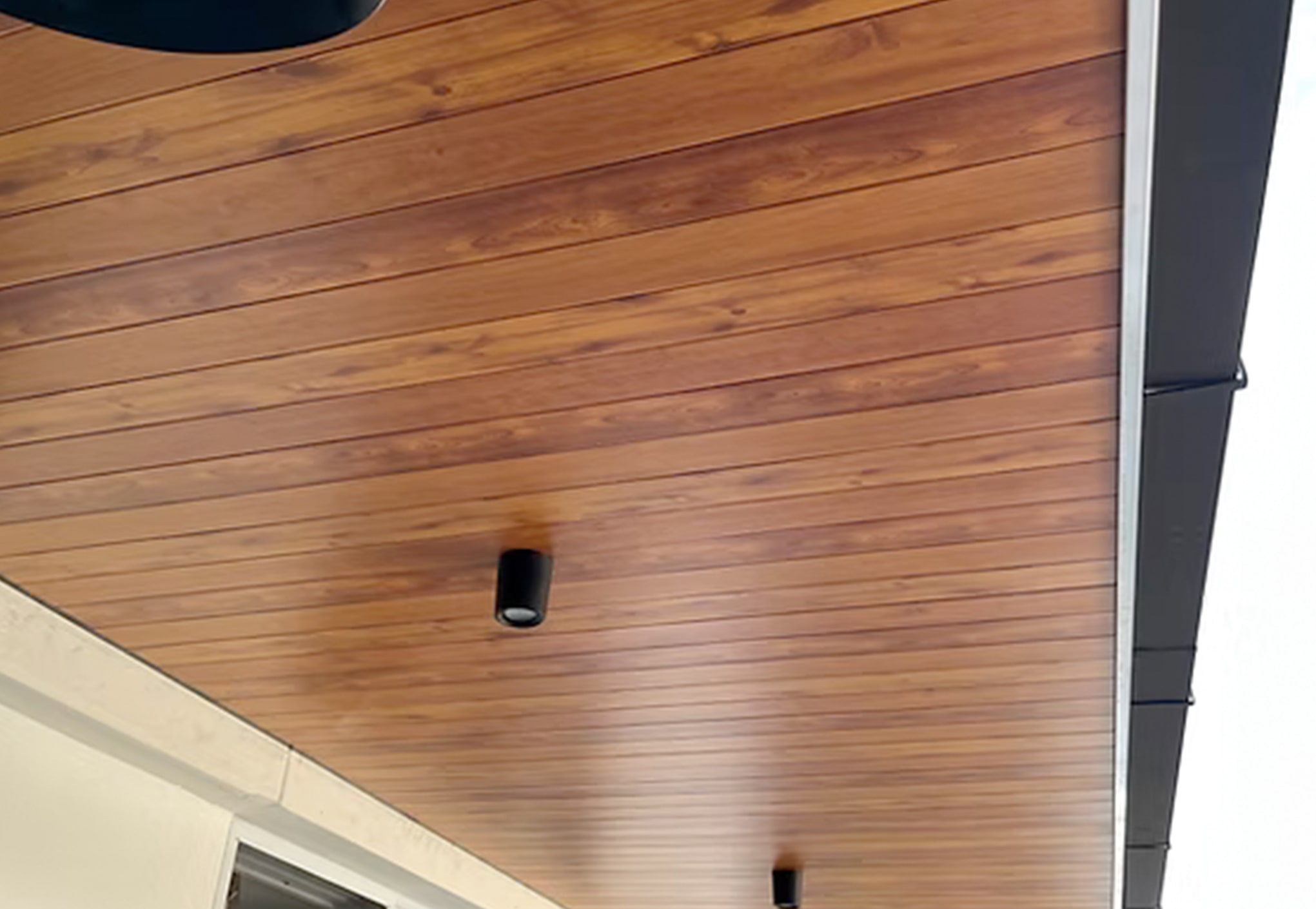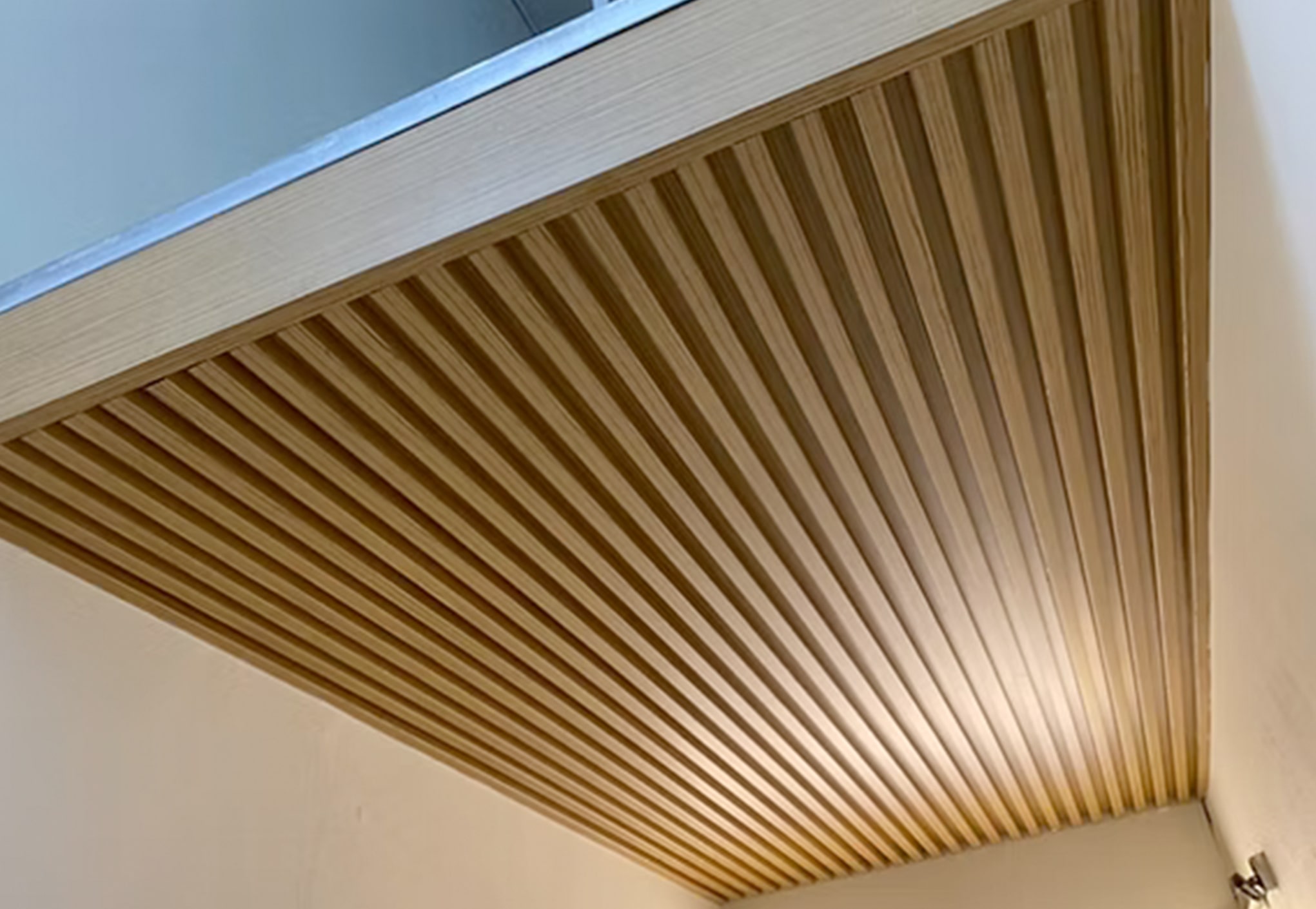 Unlike timber-look panels that mimic natural wood, the linear strip ceiling system uses narrow aluminium strips to create clean lines and a minimalist, modern finish.